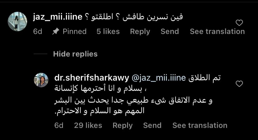 ورد شريف الشرقاوي طليق نسرين طافش في تعليق على أحد متابعيه الذي وجه له سؤالا قائلًا: فين نسرين طافش، اطلقتوا؟، ليعلق الشرقاوي: تم الطلاق بسلام وأنا أحترمها كإنسانة وعدم الاتفاق شيء طبيعي يحدث بين البشر المهم هو السلام والاحترام.