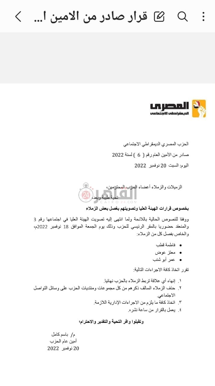 أحدهم نشر بوست على فيسبوك.. المصري الديمقراطي يفصل 3 من أعضائه | مستند