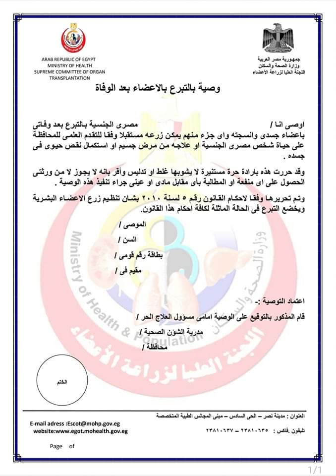 بدءًا من غدٍ.. الصحة توفر نموذج التبرع بالأعضاء بعد الوفاة بالمديريات وإدارات العلاج الحر مجانا| خاص