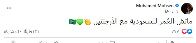 كما كتب المطرب محمد محسن منشورًا، عبر حسابه الشخصي بـ موقع التواصل الاجتماعي فيسبوك، قائلًا: ماتش العُمر للسعودية مع الأرجنتين.
