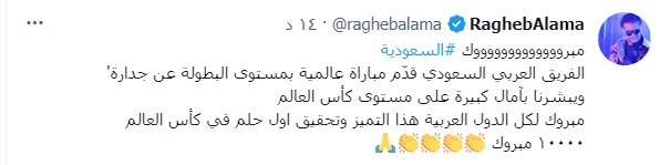 فيما قال راغب علامة، عبر حسابه الشخصي بموقع التدوينات القصيرة تويتر: مبروك السعودية.. الفريق العربي السعودي قدّم مباراة عالمية بمستوى البطولة عن جدارة، ويبشرنا بأمال كبيرة على مستوى كأس العالم.. مبروك لكل الدول العربية هذا التميز، وتحقيق أول حلم في كأس العالم 1000 مبروك.