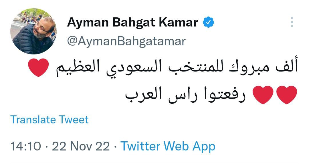 وكتب الشاعر الغنائي أيمن بهجت قمر تغريدة عبر حسابه الشخصي بموقع تويتر، قال فيها: ألف مبروك للمنتخب السعودي العظيم.. رفعتوا رأس العرب.