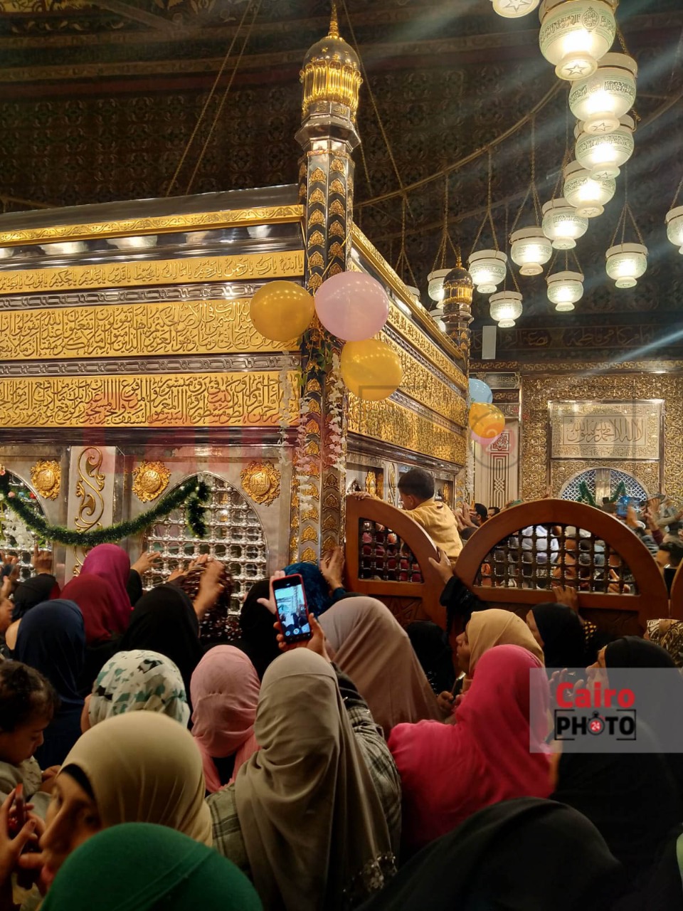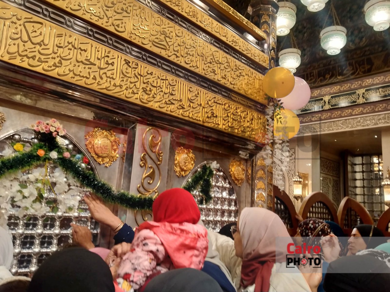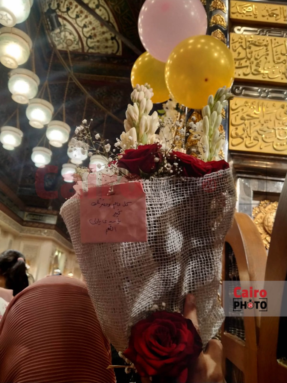 كما حرص عدد من الزوار على تزيين مقام الإمام الحسين بن علي - رضي الله عنه - الكائن في مسجده بمنطقة الحسين، مستعينين بـ البلالين والزهور وشرائط الزينة.