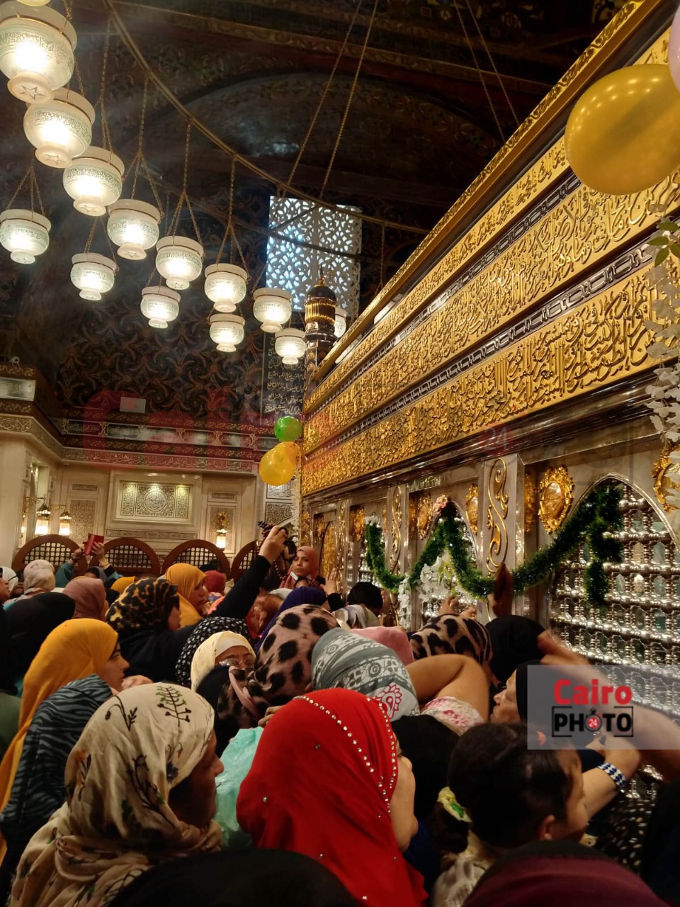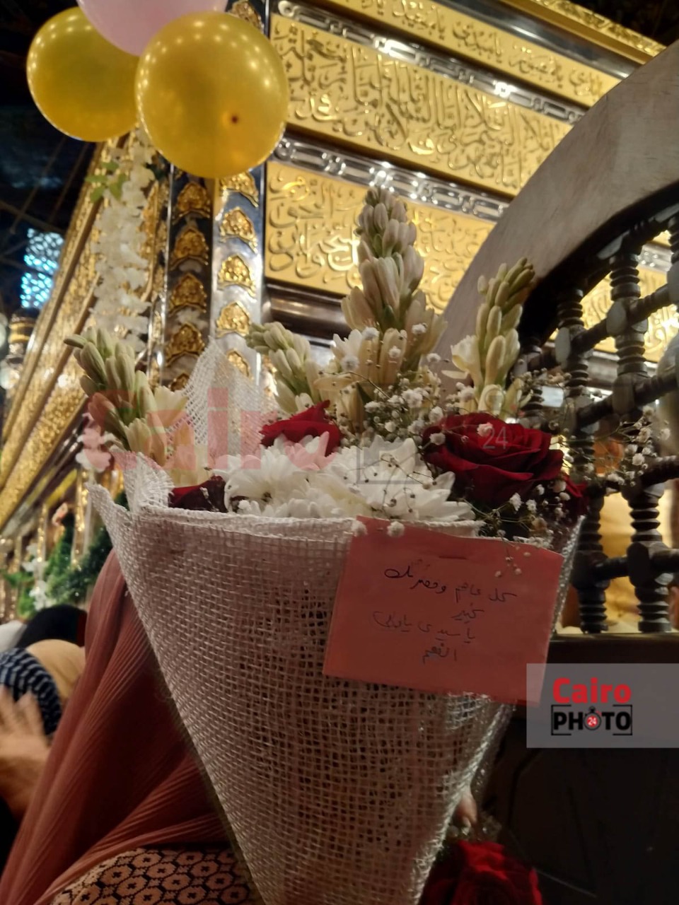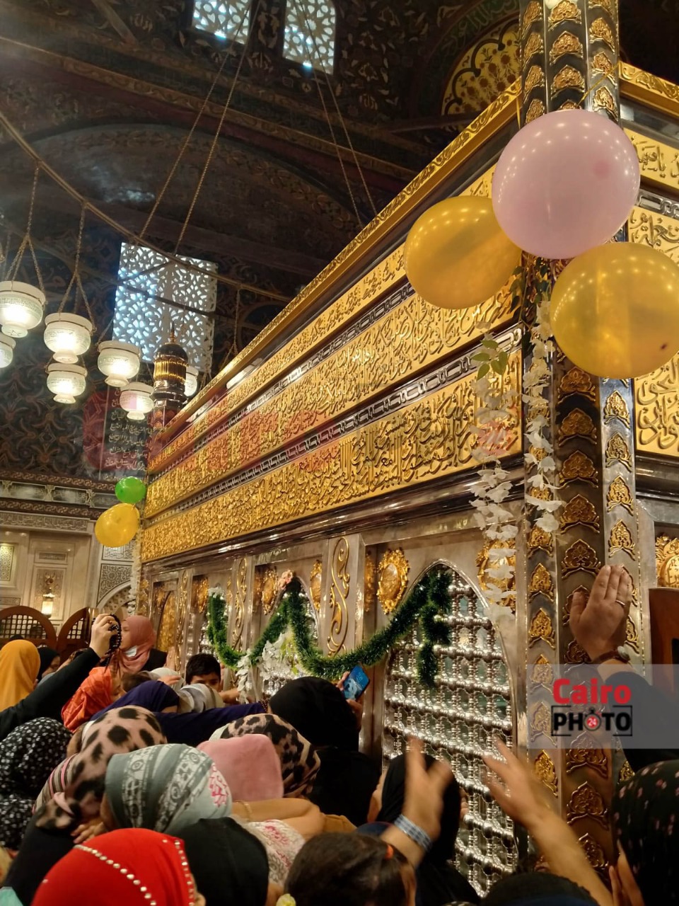 كما حرص عدد من الزوار على تزيين مقام الإمام الحسين بن علي - رضي الله عنه - الكائن في مسجده بمنطقة الحسين، مستعينين بـ البلالين والزهور وشرائط الزينة.