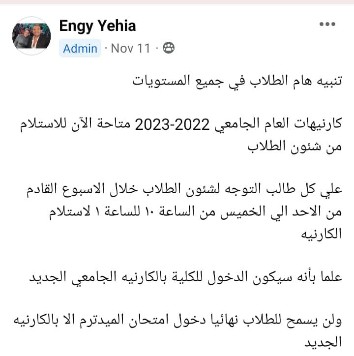 تداول عدد من رواد موقع التواصل الاجتماعي فيسبوك، منشورًا، بشأن منع دخول طلاب كلية التجارة بـ جامعة حلوان امتحانات الميدتيرم للفصل الدراسي الأول بدون الكارنيه الجديد.