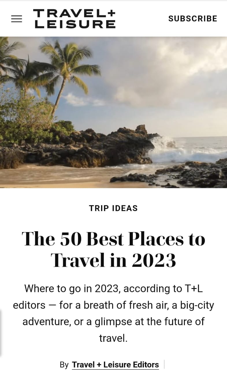 أعد موقع Travel and Leisure السياحي، قائمة تتضمن مجموعة من المقاصد السياحة المختلفة، ومن بينها مصر تحت عنوان أفضل 50 مقصدا للسفر إليه خلال عام 2023، وذلك وفقًا للمعايير والفئات التي وضعها الموقع لقرائه من الثروات الثقافية والأطعمة والمناظر الطبيعية والشواطئ وغيرها، وجاء المقصد السياحي المصري، ضمن أفضل المقاصد السياحية في فئة الثروات الثقافية.