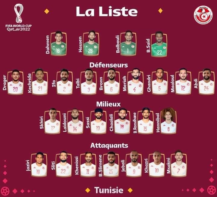 أعلن المدرب جلال القادري عن تشكيل منتخب تونس لمواجهة أستراليا في كأس العالم 2022، وجاء كالآتي: