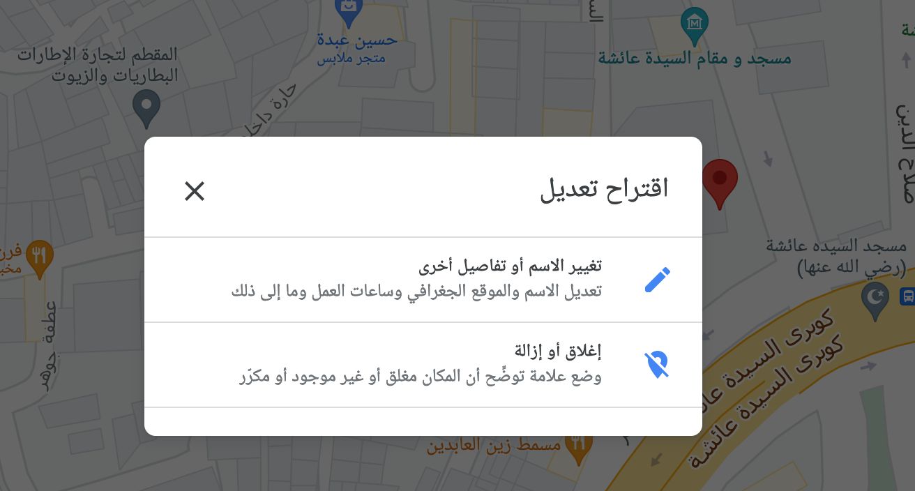 - وبعدها نضغط على اقتراح تعديل وليس إزالة، لأن الضغط على إزالة سيمحي المكان من خرائط جوجل، وهذه كارثة.
