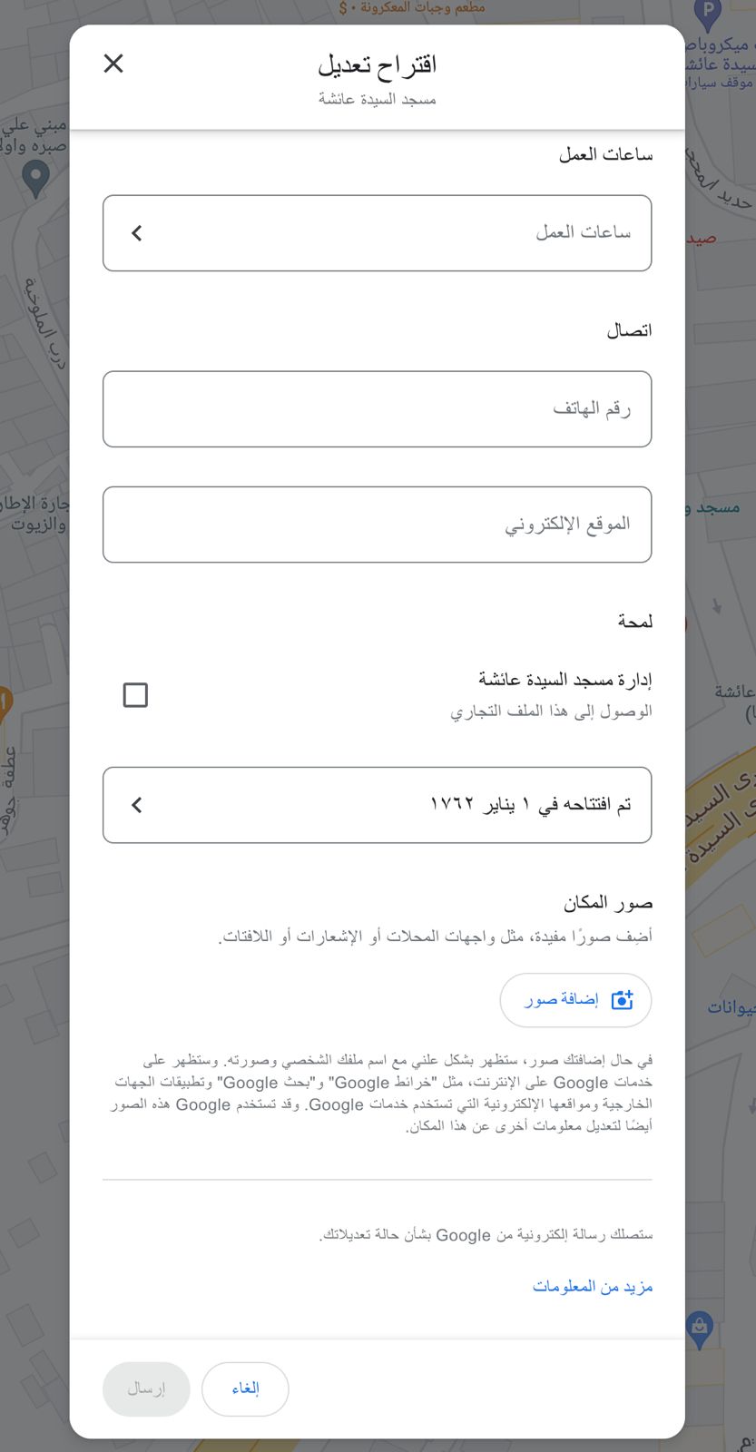 - ندخل على جوجل ماب ونبحث عن اسم المسجد الذي تظهر عليه الألفاظ المسيئة ونضغط على اقتراح تعديل.