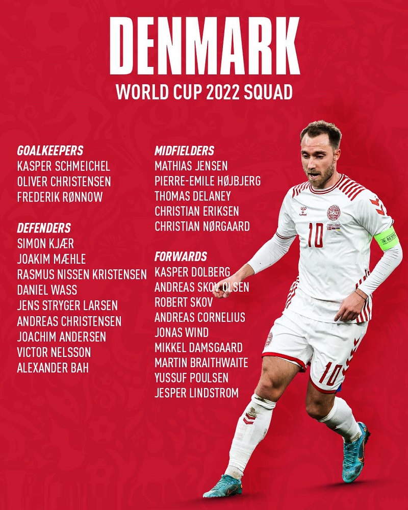 أعلن المدرب كاسبر هيولماند عن تشكيل منتخب الدنمارك لمواجهة فرنسا في كأس العالم 2022، وجاء كالآتي: