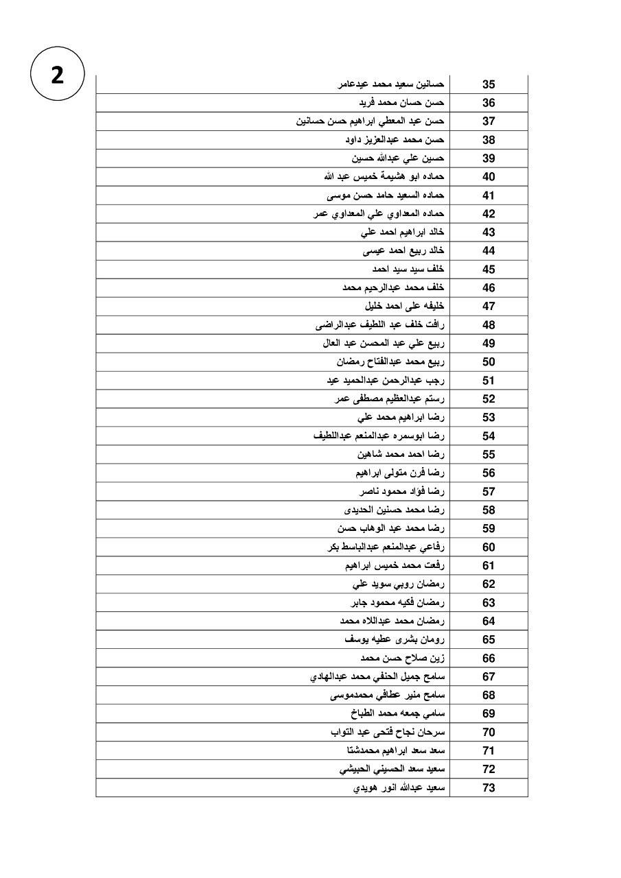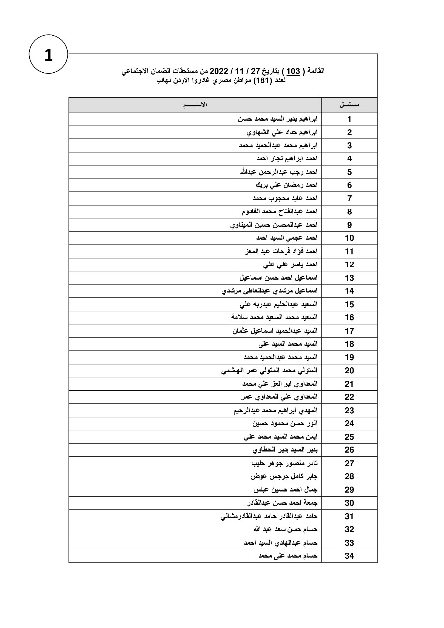 وأضاف الملحق العمالي، أنه طبقًا لإجراءات المؤسسة العامة للضمان الاجتماعي بالأردن؛ سيتم استرجاع المبالغ غير المصروفة بعد مرور 50 يومًا من تاريخ إعلان تحويل المستحقات، مشيرًا إلى أنه يتم بشكل مُستمر؛ التنسيق والتجهيز لإرسال باقي الدفعات لمستحقيها تباعًا، فور تدقيقها من الجهات المعنية حفاظًا على حقوق المواطنين المستحقين لهذه الدفعات، حيث تضم القائمة الجديدة؛ الأسماء المرفقة مع هذا البيان: