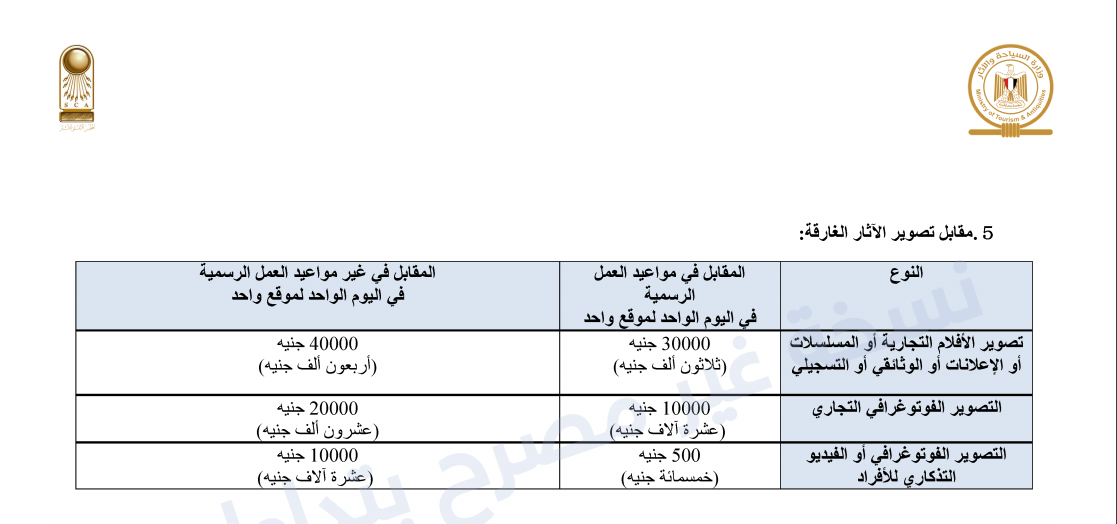 وجاءت أسعار تصوير الآثار الغارقة كالتالي: