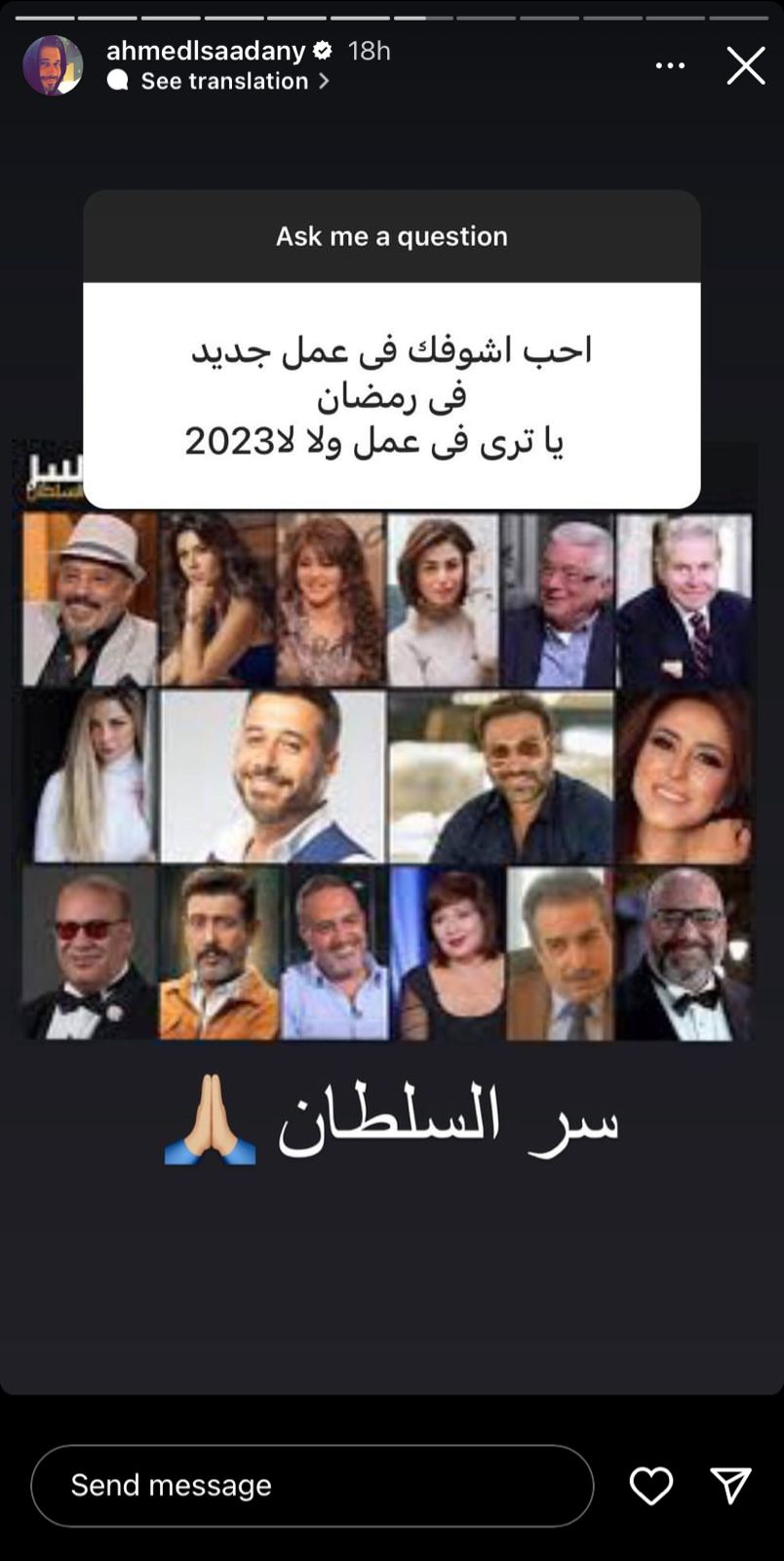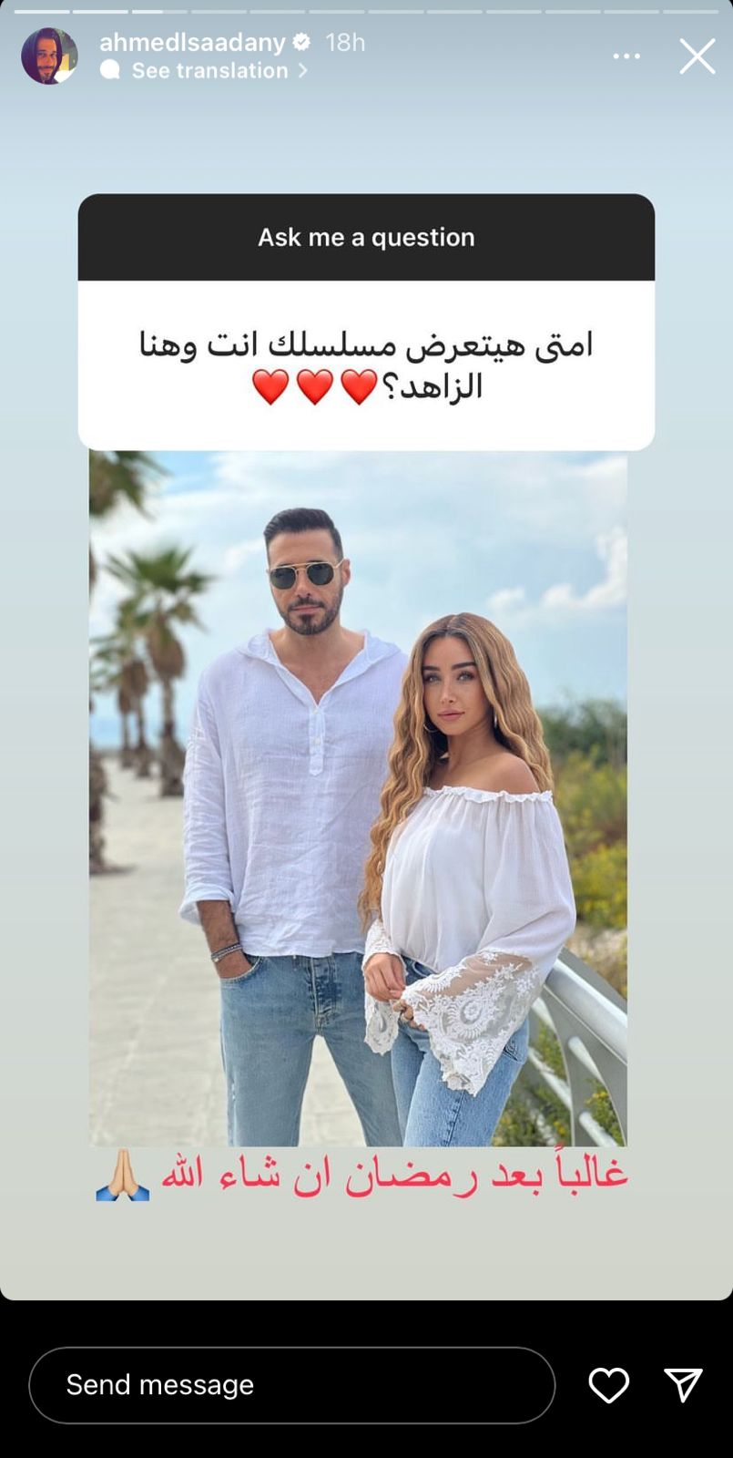 ورد أحمد السعدني على أحد متابعيه خلال خاصية ستورى على حسابه الشخصي بموقع تبادل الصور والفيديوهات انستجرام، بشأن موعد عرض مسلسله الجديد سيب وأنا سيب، الذي يشارك فيه بجانب الفنانة هنا الزاهد، حيث قال: غالبًا هيتعرض بعد رمضان إن شاء الله.
