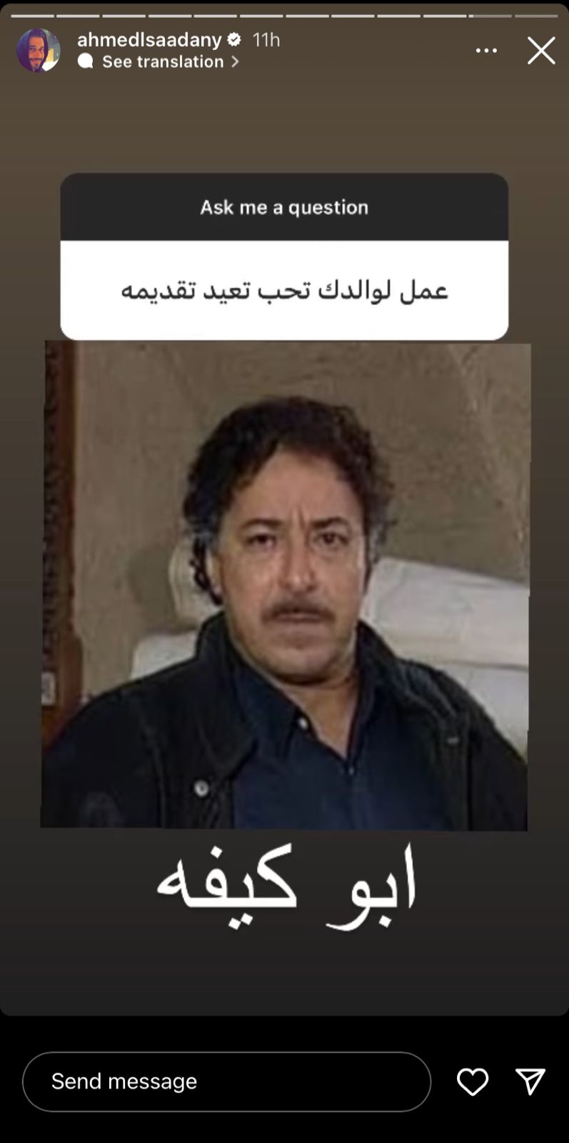 وعلق أحمد السعدني على سؤال أحد المتابعين له حول العمل الذي قدمه والده ويتمنى إعادة تقديمه، حيث قال: شخصية أبو كيفه لوالده للفنان صلاح السعدني.