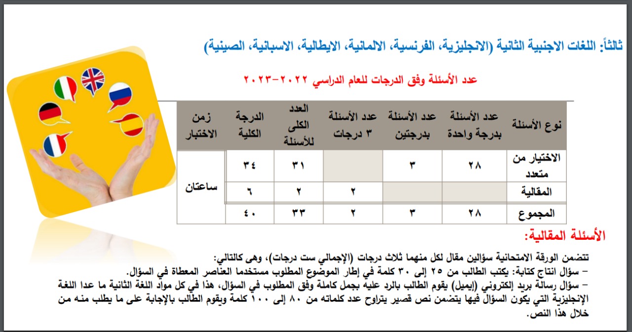 - سؤال رسالة بريد إلكتروني (إيميل) يقوم الطالب بالرد علية بجمل كاملة وفق المطلوب في السؤال، هذا في كل مواد اللغة الثانية ما عدا اللغة الإنجليزية التي يكون السؤال فيها يتضمن نص قصير يتراوح عدد كلماته من 80 إلى 100 كلمة ويقوم الطالب بالإجابة على ما يطلب منه من خلال هذا النص.