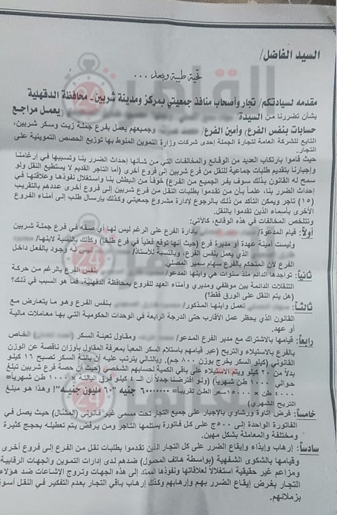 مقدمه لسيادتكم تجار وأصحاب منافذ جمعيتي بمركز ومدينة شربين، محافظة الدقهلية بشأن تضررنا من «س. س. ل»، ونجلها «م. ط » والذي يعمل مراجع حسابات بنفس الفرع وأمين الفرع «م. ع»، وجميعهم يعمل بفرع جملة زيت وسكر شربين التابع للشركة العامة لتجارة الجملة إحدى شركات وزارة التموين المنوط بها توزيع الحصص التموينية على التجار.