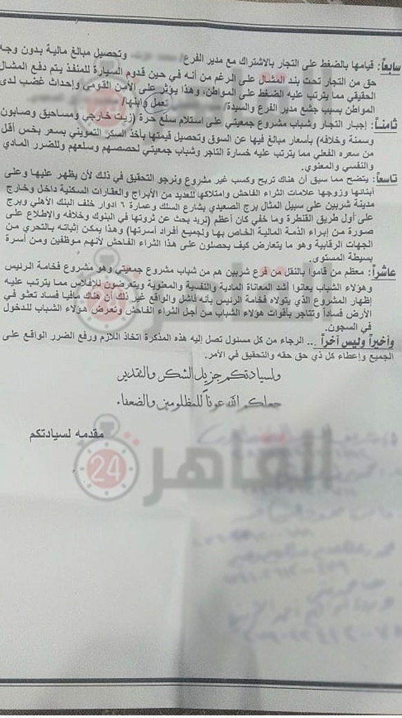 عاشرًا: معظم من قاموا بالنقل من فرع شربين هم من شباب مشروع جمعيتي وهو مشروع فخامة الرئيس وهؤلاء الشباب يعانوا أشد المعاناة المادية والنفسية والمعنوية ويتعرضون للإفلاس مما يترتب عليه إظهار المشروع الذي يتولاه فخامة الرئيس بأنه فاشل والواقع غير ذلك أن هناك مافيا فساد تعثو في الأرض فسادًا وتتاجر بأقوات هؤلاء الشباب من أجل الثراء الفاحش وتعرض هؤلاء الشباب للدخول في السجون.