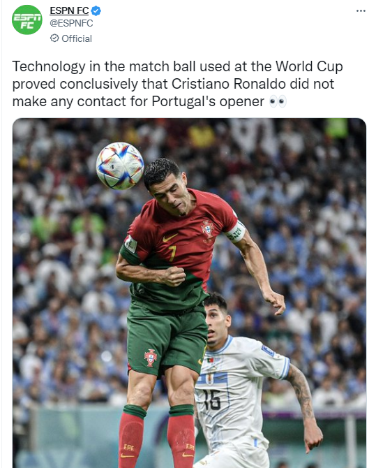 باستخدام التقنية المتصلة في كرة المباراة الرسمية، يمكننا بشكل نهائي تأكيد أن الكرة لم تلمس رونالدو في الهدف الأول، وأن الكرة بها جهاز استشعار IMU (500 هيرتز)، يتيح لنا استشعار لمس الكرة، وحركة الجهاز شبيهة بنبضات القلب عند لمس الكرة.