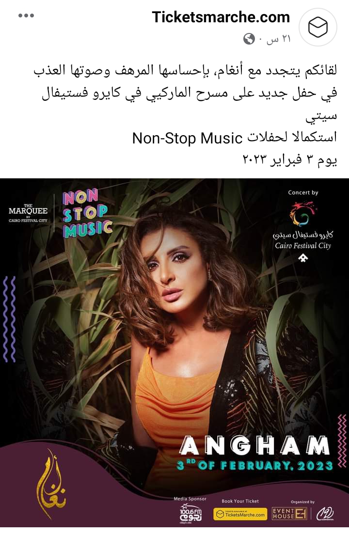 وكانت الجهة المنظمة للحفل أعلنت عبر حسابها الشخصي بموقع فيسبوك، بموعد حفل أنغام، حيث كتبت منشورًا جاء فيه: لقاؤكم يتجدد مع أنغام، بإحساسها المرهف وصوتها العذب، في حفل جديد على مسرح الماركيي في كايرو فستيفال سيتي، استكمالا لحفلات Non-Stop Music، يوم 3 فبراير 2023.