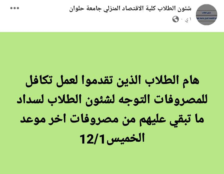 اقتصاد منزلي حلوان توجه طلاب التكافل بسرعة سداد المصروفات الدراسية المتبقية