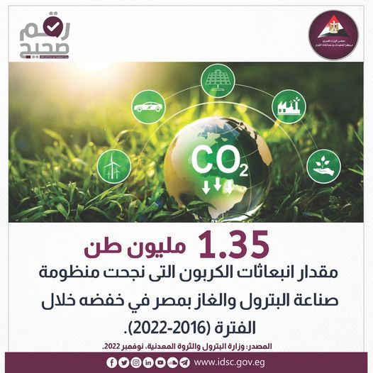 نشر مركز المعلومات ودعم اتخاذ القرار، التابع لـ مجلس الوزراء، إنفوجرافا سلط الضوء فيه على مقدار الانبعاثات الكربونية التي نجحت منظومة صناعة البترول والغاز الطبيعي بمصر في خفضه، خلال الفترة 2016 - 2022.
