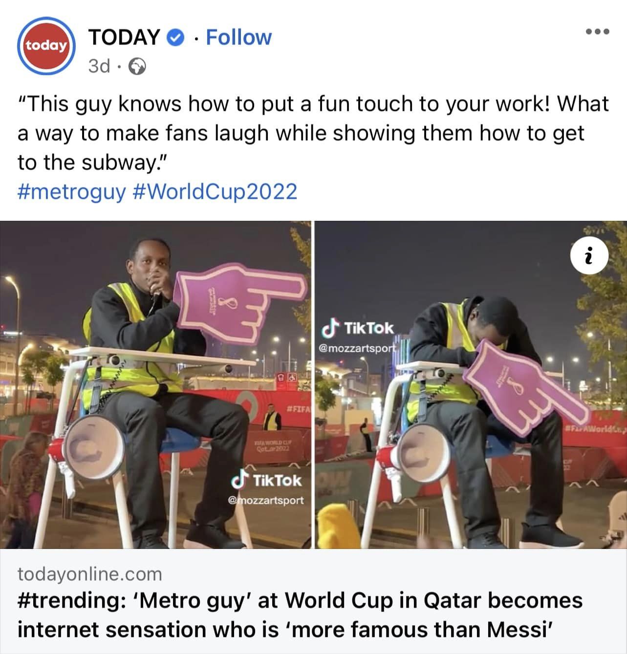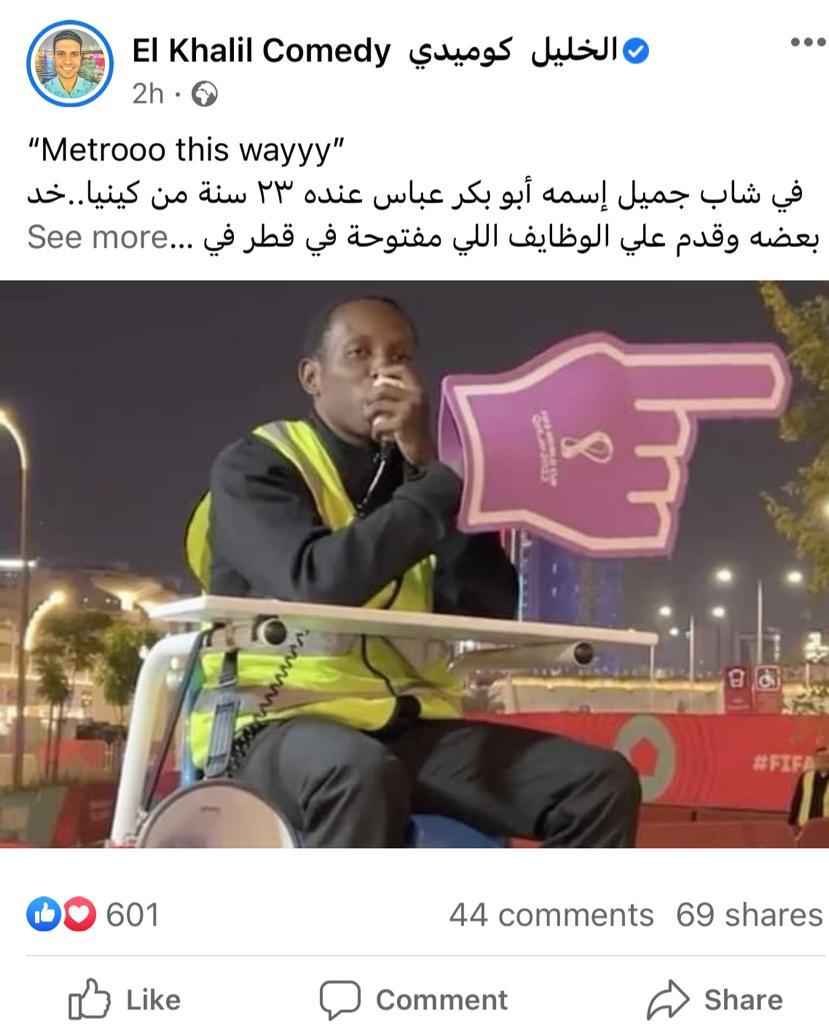 تصدر الشاب الكيني أبو بكر عباس أو الملقب بمترو جاى، التريند العالمي على مواقع التواصل الاجتماعي المختلفة، وتحدثت عنه الصحف العالمية، كما كرمته قطر عن الأداء الجيد لعمله، ومن بعدها فيفا في احتفال شاهده الملايين.