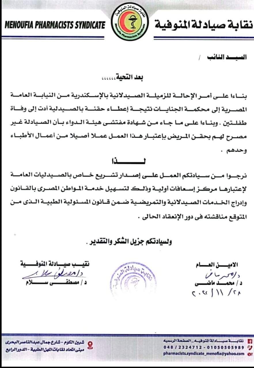 وتابع نقيب الصيادلة في خطابة للجهات المعنية: في ظل حادثة عارضة بإحدى صيدليات الإسكندرية، والتي ترتب على أثرها تحميل كافة المسئولية الجنائية للصيدلانية، جراء إعطاء حقنة، علمًا باتخاذها كافة التدابير الطبية اللازمة، وإذ يفاجئ المجتمع الصيدلي المصري، بتوجيه اتهام تعمد القتل للصيدلانية من قبل النيابة العامة المصرية، وتحويل القضية إلى الجنايات، وحفاظًا على صيادلة المنوفية فقد اتخذت النقابة العامة لصيادلة مصر، قرارًا بمنع إعطاء الحقن بالصيدليات نهائيًا.