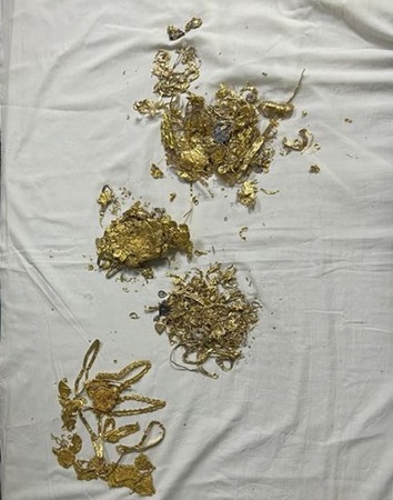 عقب تقنين الإجراءات أمكن ضبطه وبحوزته كمية من كسر المشغولات الذهبية وزنت حوالى كيلو وسبعة وثلاثون جرام ذهب تقريبًا قام بإخفائها داخل حذائه بقصد تهريبها لداخل البلاد بالمخالفة للقانون، وبمواجهته إعترف بإرتكابه الواقعة، قدرت قيمة الرسوم والتعويض بإجمالى مبلغ2،558،071 مليون جنيه، وتم إتخاذ الاجراءات القانونية.