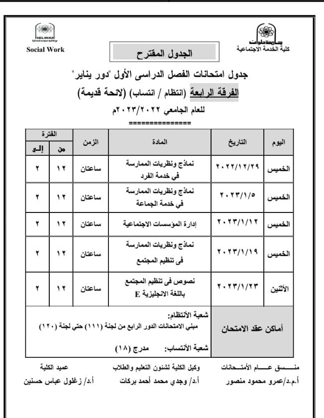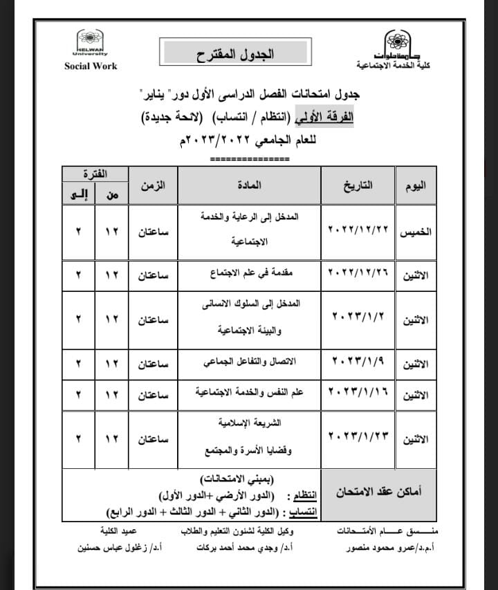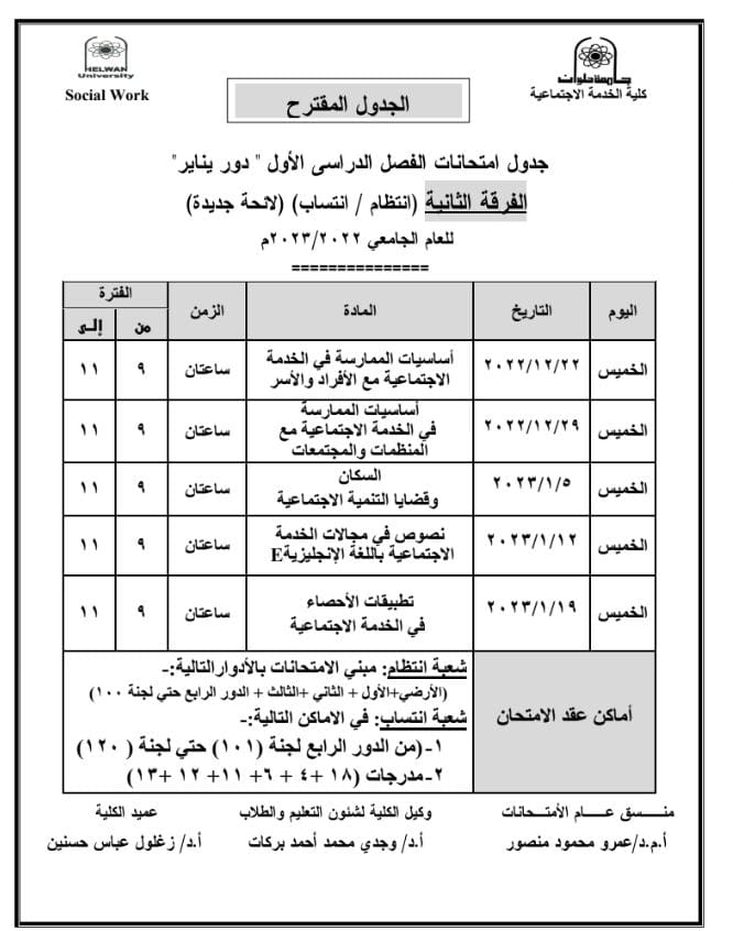 ننشر جداول امتحانات الترم الأول المقترحة لطلاب خدمة اجتماعية جامعة حلوان| صور