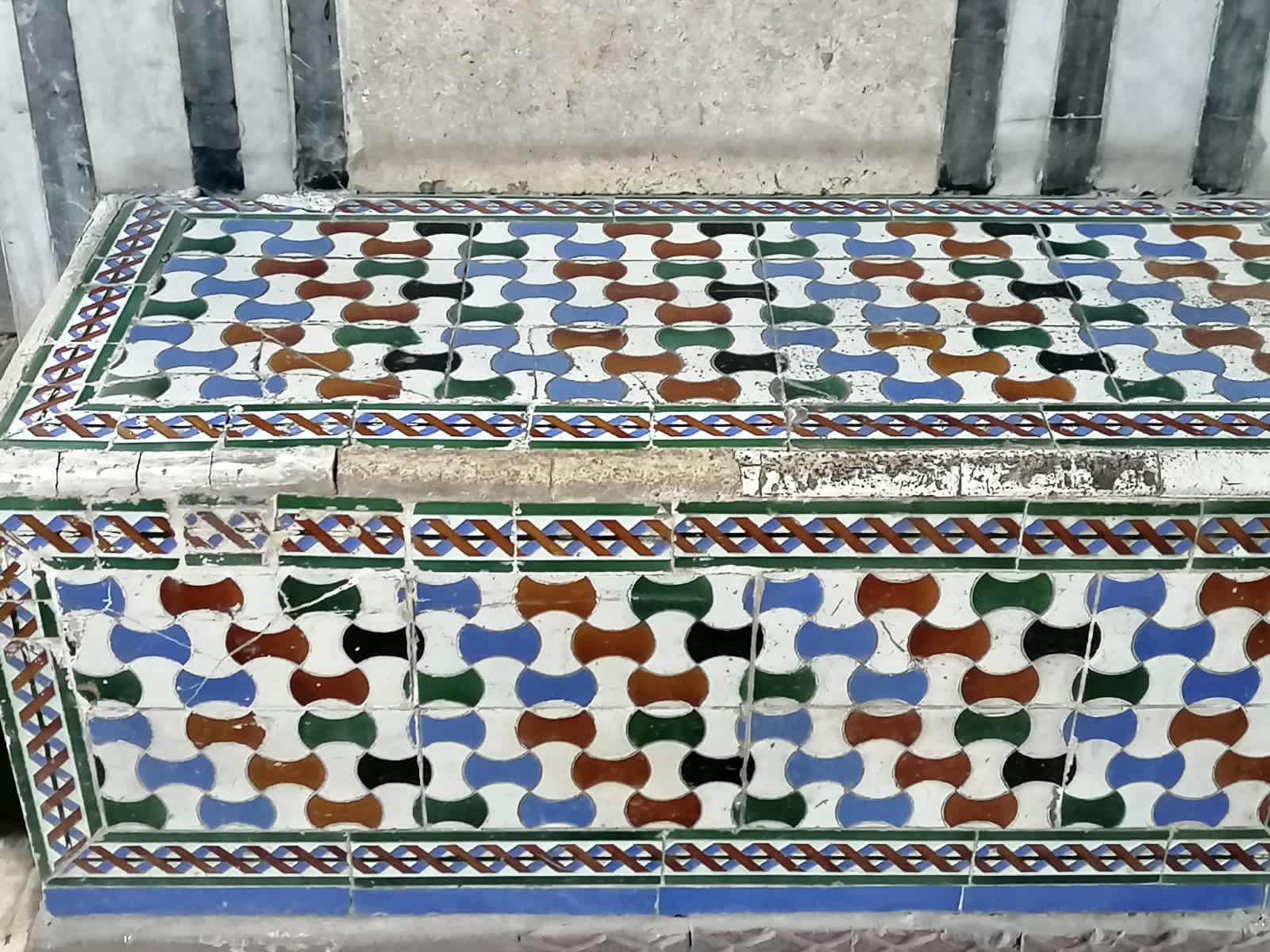 يلي المدخل الرئيسي مباشرة، بهو مقسم إلى جزئين، خارجي وداخلي، لهما سقفان مختلفان في الزخارف، فالخارجي عبارة عن وحدات هندسية متكررة وأطباق نجمية وبداخل كل وحدة زخرفة نباتية باللون الأبيض على أرضية لونها كحلي، تفصلها سدائب خشبية بنية اللون.