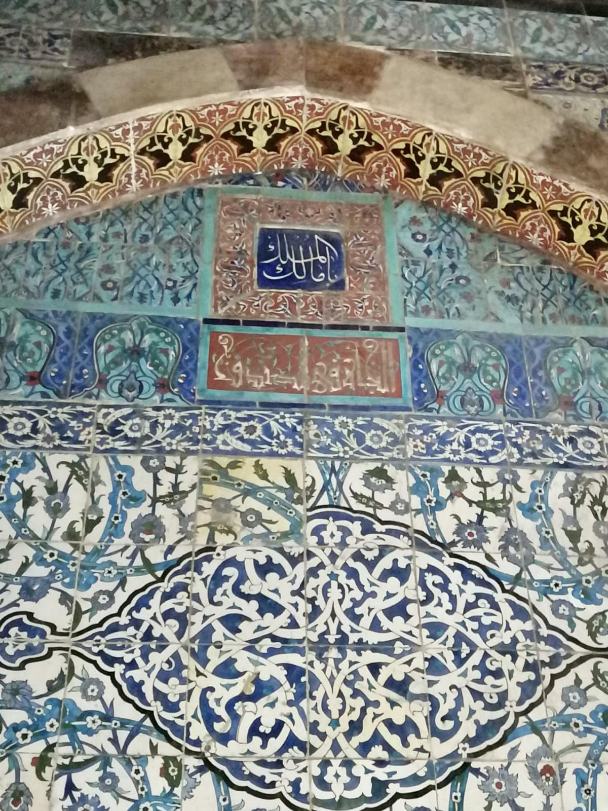 أما السقف الداخلي فمحلى بأشكال نجمية وأنصاف كرات بيضاء على أرضية لونها بني، وجدران البهو مقسمة إلى قسمين: السفلي مكسو ببلاطات من الرخام، والقسم العلوي مكسو ببلاطات من القيشاني على بعضها كتابات مثل لفظ الجلالة "الله"، و"محمد"، و"مالك الملك"، كما توجد أربع آرائك من الحجر المكسو بالقاشاني تشبه المكاسل التي توجد عند مداخل بعض المساجد وخاصة المملوكية.