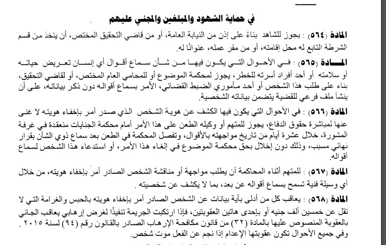 وتضمن القانون سالف الذكر، بعض المواد الخاصة بحماية الشهود والمبلغين والمجني عليهم، لافتًا إلى أنه في الأحوال التي يكون فيها الكشف عن هوية الشخص الذي صدر أمر بإخفاء هويته لا غنى عنها لمباشرة حقوق الدفاع، يجوز للمتهم أو وكيله الطعن على هذا الأمر أمام محكمة الجنايات منعقدة في غرفة المشورة، خلال عشرة أيام من تاريخ مواجهته بالأقوال، وتفصل المحكمة في الطعن بعد سماع ذوي الشأن بقرار نهائي مسبب، وذلك دون إخلال بحق محكمة الموضوع في إلغاء هذا الأمر، أو استدعاء هذا الشخص لسماع أقواله.