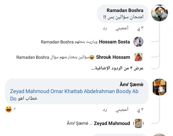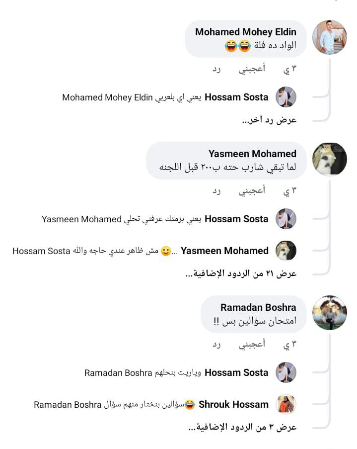وأشار حسام إلى أن هناك طالب آخر لم يقوم بتسليم ورقة الامتحان الخاصة به فـ قمت بأخذها وكتبت تلك الإجابات على سبيل الهزار مع الزملاء على مواقع التواصل الاجتماعي، معقبًا: أنه معروف بين الطلاب والأساتذة ويعلمون أنه يحب الهزار طوال الوقت.