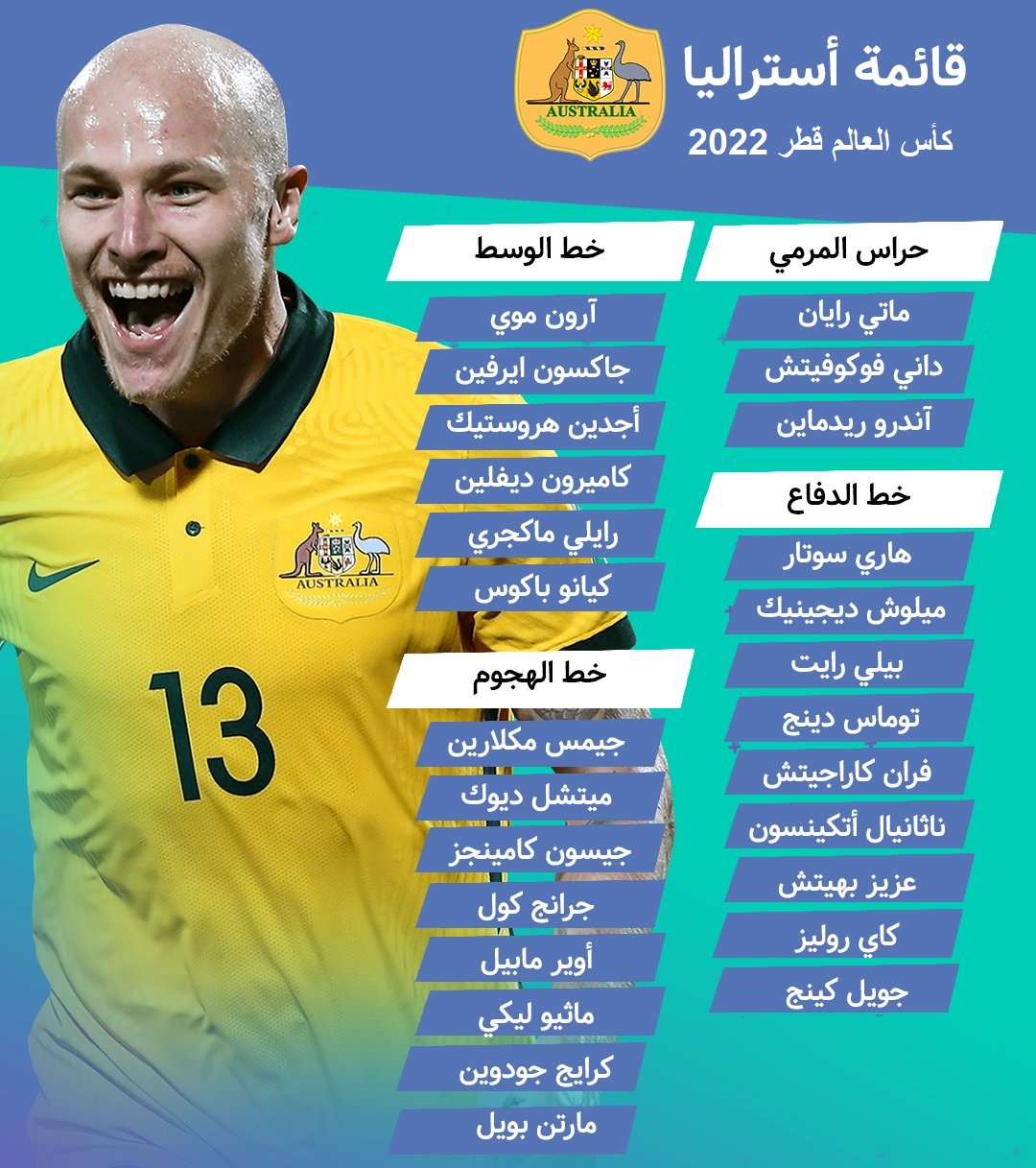 أعلن المدرب جراهام أرنولد عن تشكيل منتخب أستراليا لمواجهة الأرجنتين في كأس العالم قطر 2022، وجاء كالآتي: