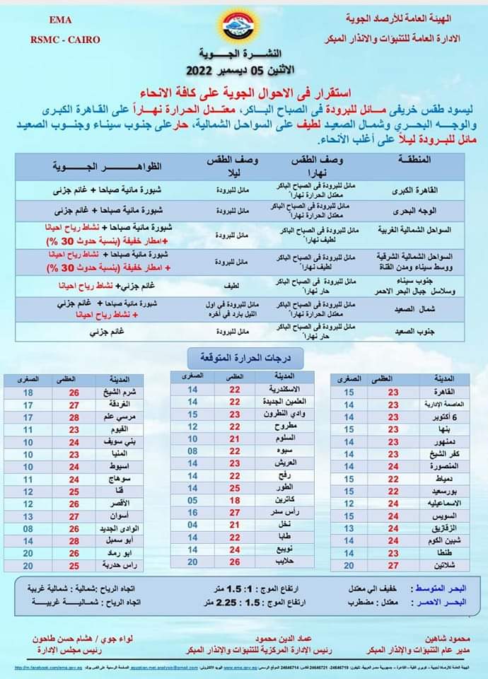 وتسجل القاهرة الكبرى للحرارة العظمى 23 درجة مئوية، أما الصغرى فتصل إلى 15 درجة مئوية، وتشهد مع الوجه البحري شبورة مائية صباحًا وغيومًا جزئية، وفقًا لـ هيئة الأرصاد الجوية.