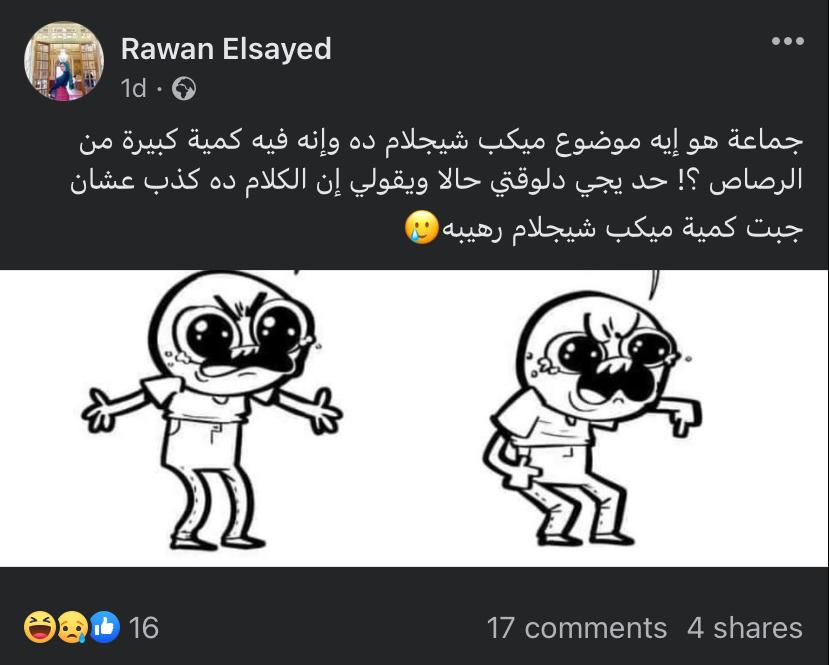 كتبت روان السيد، عبر منشور لها بموقع فيس بوك: جماعة هو موضوع ميك آب شيجلام ده، وإنه فيه كمية كبيرة من الرصاص.. حد يقولي إن الكلام دا كذب، وذلك في استغراب منها لما تحتويه المنتجات على كميات هائلة من الرصاص.