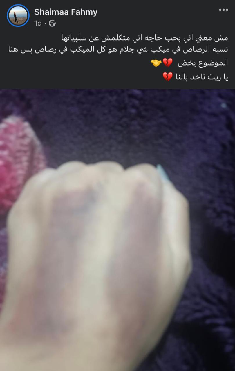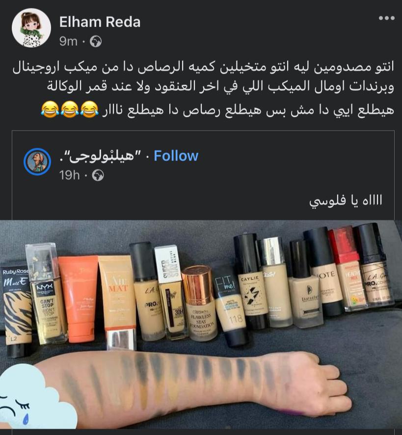 وروت فتاة أخرى، قصتها مع منتجات التجميل التي تحتوي على الميك آب، حيث كتبت في منشور لها، الناس بتنسى إن الميك آب فيه رصاص.. محدش بيكلف نفسه ويفهم الموضوع صح، كل الميك آب اللي من أغلى البراندات فيه رصاص وقائمة كبيرة من المعادن السامة زي الزرنيخ والكادميوم والنيكل والسيلينيوم، فـ عشان تحافظي على نفسك اهتمي ببشرتك وسكين كير وجلسات أفضل.