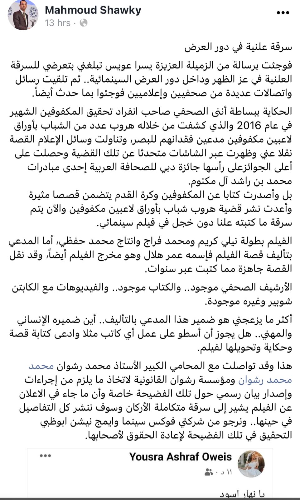 وكتب الصحفي محمود شوقي على حسابه الشخصي بـ فيس بوك: سرقة علنية في دور العرض، فوجئت برسالة من الزميلة العزيزة يسرا عويس تبلغني بتعرضي للسرقة العلنية في عز الظهر وداخل دور العرض السينمائية.. ثم تلقيت رسائل واتصالات عديدة من صحفيين وإعلاميين فوجئوا بما حدث أيضًا.