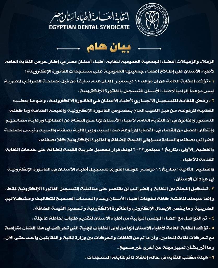 وقالت النقابة، إنه تم التواصل مع أعضاء المجلس النيابية من أطباء الأسنان، لتقديم طلبات إحاطة عاجلة، مؤكدة أنها من أولى النقابات المهنية التي تحركت في هذا الشأن مُتزامنة مع تحركات نقابة المحامين، وأن ما تم من اتفاقات وتحركات بين وزارة المالية والنقابتين واحد حتى الآن، وما أثير بشأن تمييز مهنة عن أخرى غير صحيح، موضحة أن القضية الثانية أقيمت بتاريخ بتاريخ 16 نوفمبر للوقف الفوري، لتسجيل أطباء الأسنان في الفاتورة الإلكترونية، كما أن هيئة مكتب النقابة في حالة انعقاد دائم لمتابعة المستجدات.