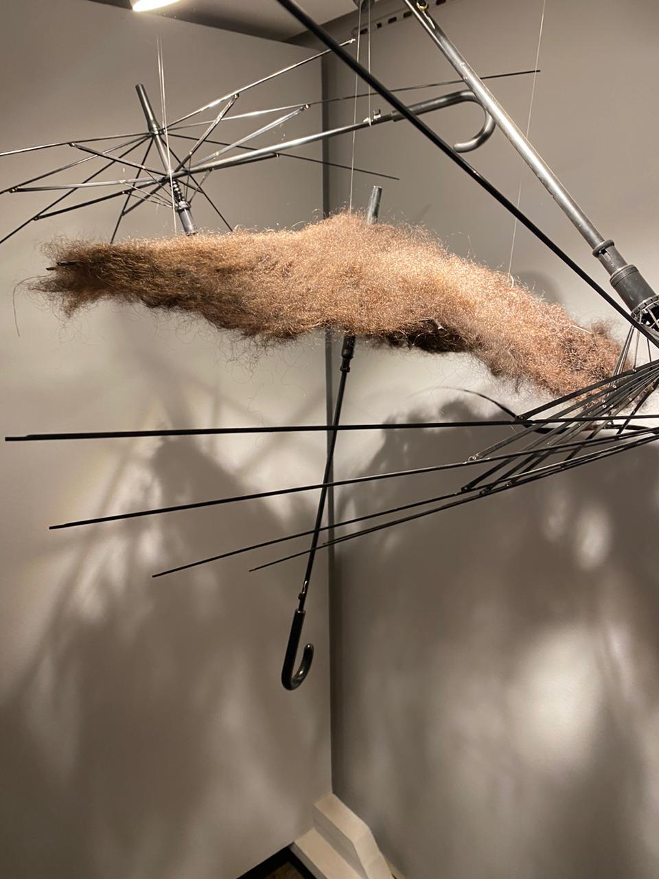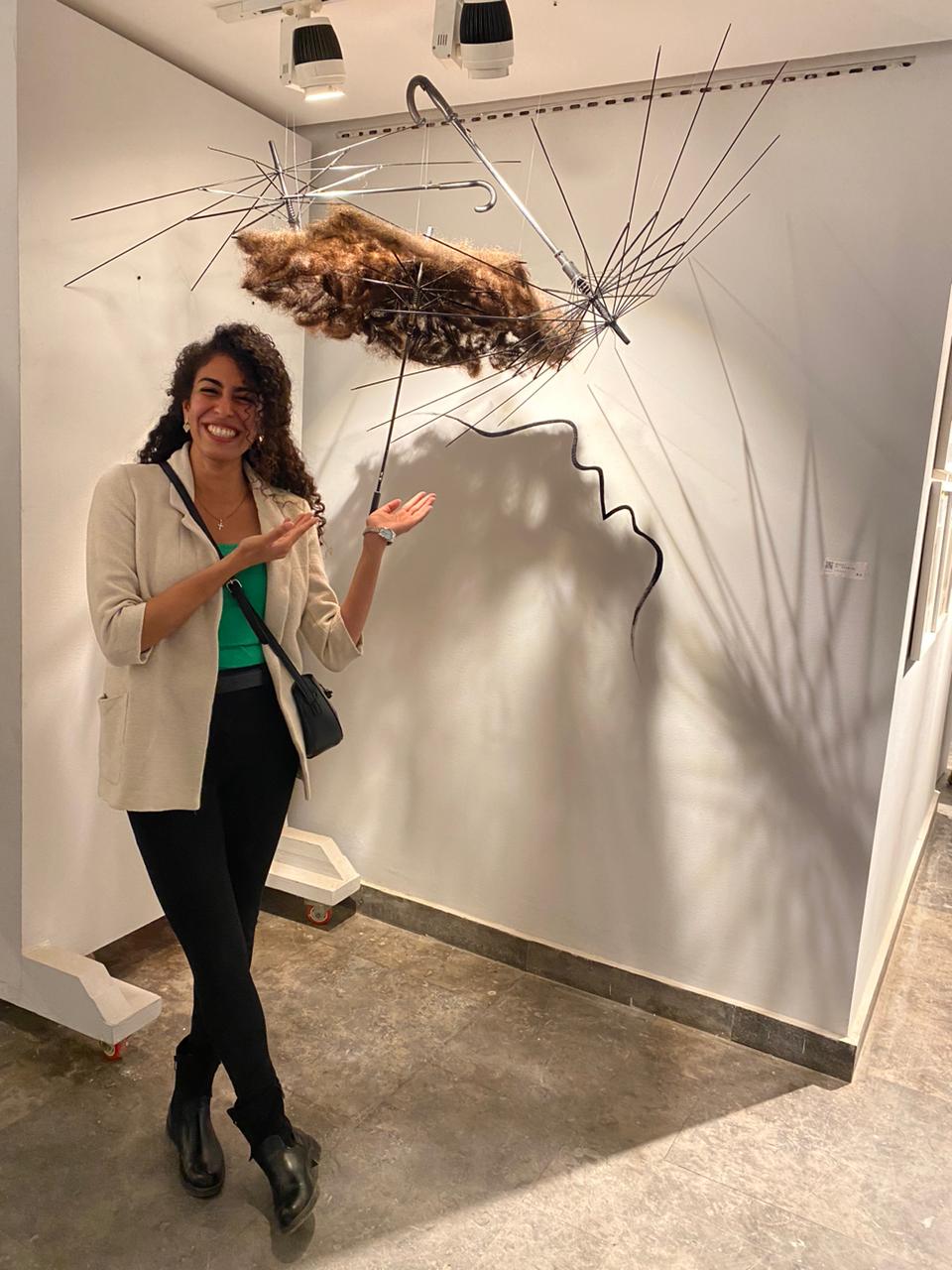 وتضيف أنها استخدمت الشمسية، حيث إنها تستخدم للحماية، وأزالت الهيكل الخارجي للشمسية ووضعت مكانه الشعر، لتعبر أن فقدان شخص غال في حياتنا يعني فقدان مصدر الأمان.