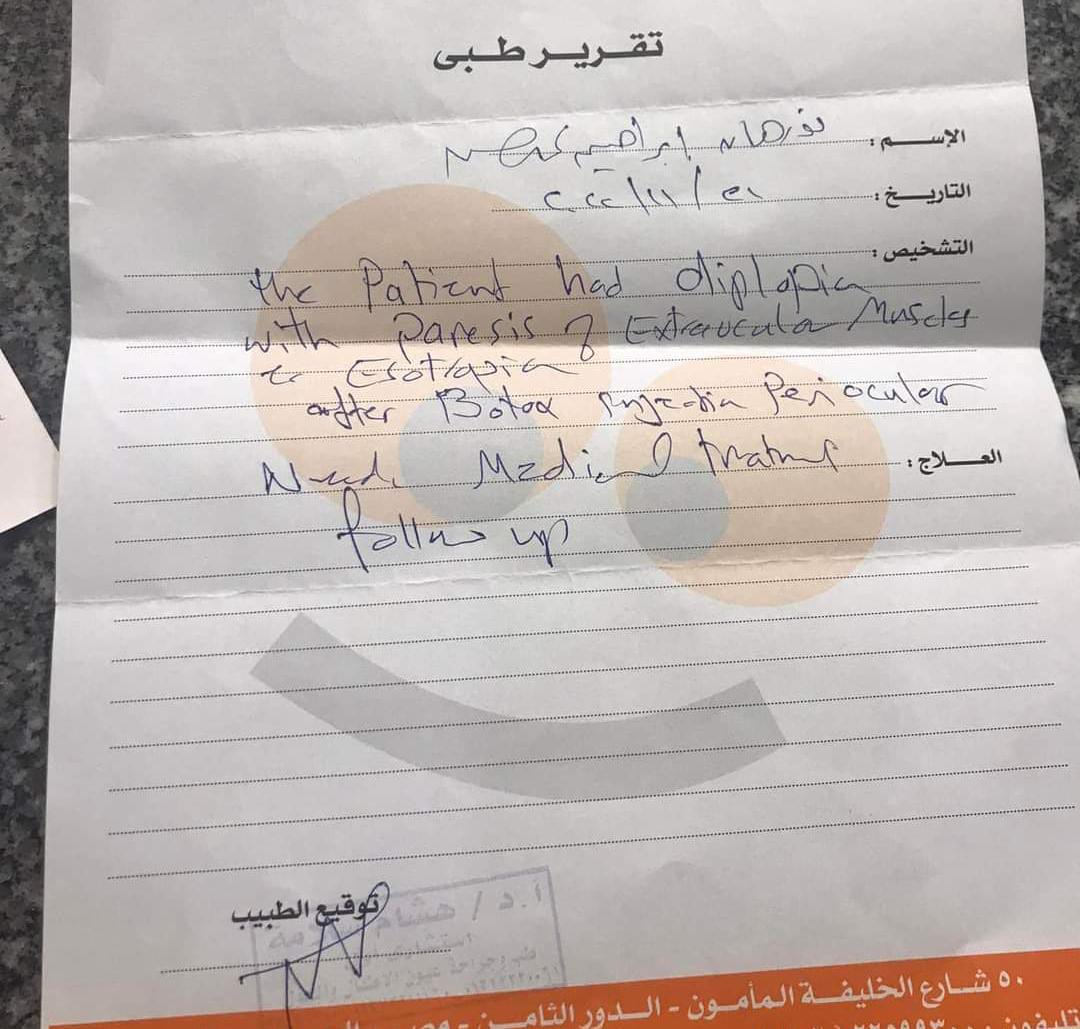 زعمت شابة تدعى نورهان إبراهيم محمد، طبيبة أسنان، بإصابتها بالرؤية الازدواجية أو المعروفة بـ الحَول في عينيها، بالإضافة إلى ضعف شديد في الرؤية، بعدما خضعت لإجراء حقن بوتوكس، لإزالة الهالات السوداء من العين.