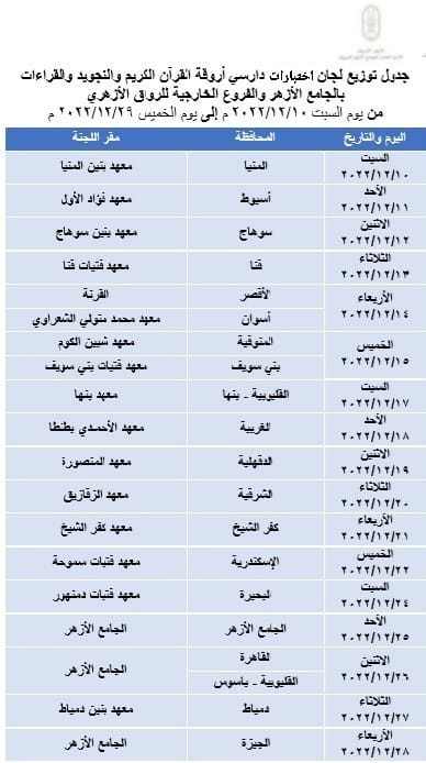 ومن المقرر أن تنعقد لجان الاختبار برئاسة الشيخ حسن عبد النبي عراقي، وكيل لجنة مراجعة المصحف، كما تمتد الاختبارات مدة 18 يومًا، حيث تم تخصيص يوم لدارسي كل محافظة، وفق ما هو موضح في الجدول المرفق، على أن يكون تواجد الدارسين بمقر اللجنة ابتداءً من الساعة الواحدة ظهرًا.