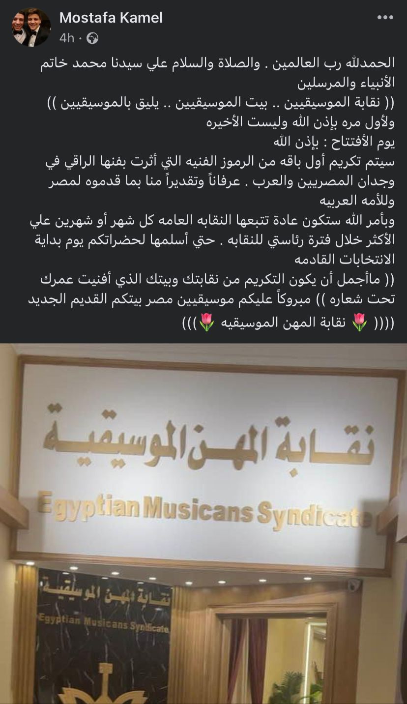 ونشر مصطفى كامل، صورة للنقابة بعد التجديدات، عبر حسابه الشخصي بموقع التواصل الاجتماعي، فيسبوك، وعلق: الحمد لله رب العالمين، والصلاة والسلام على سيدنا محمد، خاتم الأنبياء والمرسلين، نقابة الموسيقيين.. بيت الموسيقيين.. يليق بالموسيقيين.