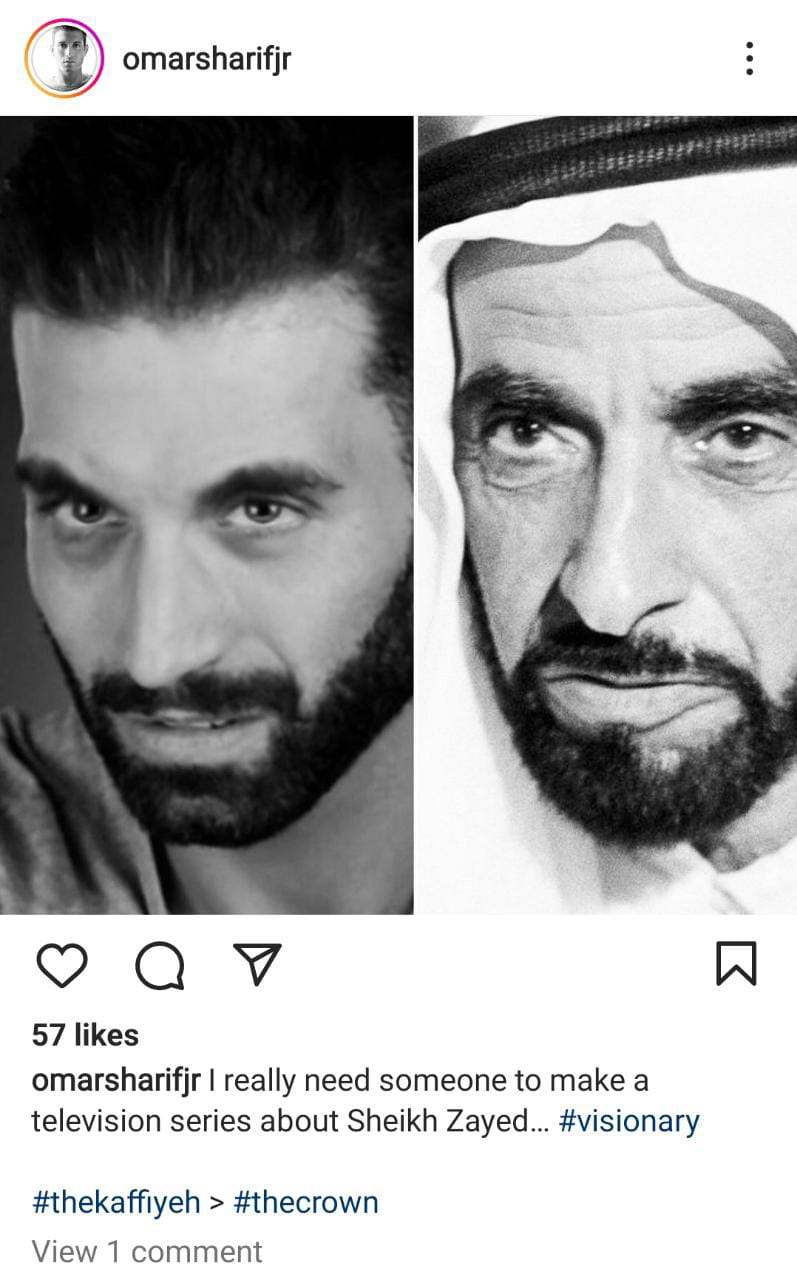 ونشر حفيد عمر الشريف، صورة له - مُدمجة مع صورة لـ الشيخ زايد، عبر حسابه الشخصي بموقع تبادل الصور والفيديوهات انستجرام، وعلق قائلًا: أنا حقًا بحاجة لمن يصنع مسلسلًا عن الشيخ زايد.
