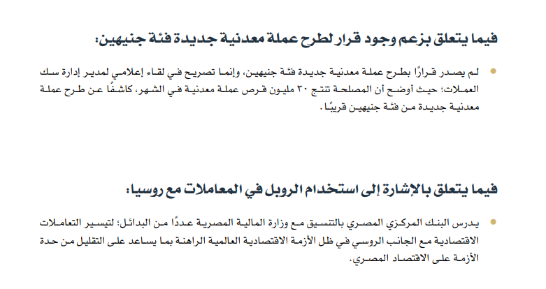 وفيما يتعلق بزعم وجود قرار لطرح عملة معدنية جديدة فئة جنيهين، قالت الحكومة، إنه لم يصدر قرار بطرح عملة معدنية جديدة فئة جنيهين، وإنما تصريح في لقاء إعلامي لمدير إدارة سك العملات؛ حيث أوضح أن المصلحة تنتج 30 مليون قرص عملة معدنية في الشهر، كاشفا عن طرح عملة معدنية جديدة من فئة جنيهين قريبا.