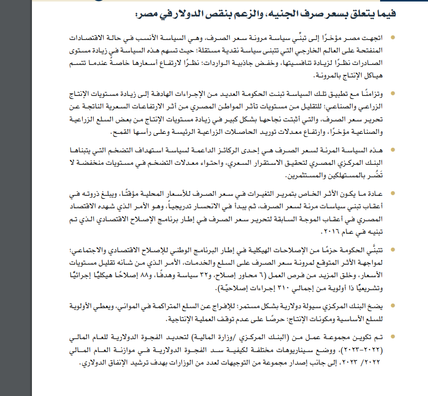 وحول المزاعم التي تتعلق بسعر الصرف اتجهت مصر مؤخرًا إلى تبني سياسة مرونة سعر الصرف، وهي السياسة الأنسب في حالة الاقتصادات المنفتحة على العالم الخارجي التي تتبنى سياسة نقدية مستقلة؛ حيث تسهم هذه السياسة في زيادة مستوى الصادرات نظرًا لزيادة تنافسيتها، وخفض جاذبية الواردات؛ نظرًا لارتفاع أسعارها خاصة عندما تتسـم هياكل الإنتاج بالمرونة.