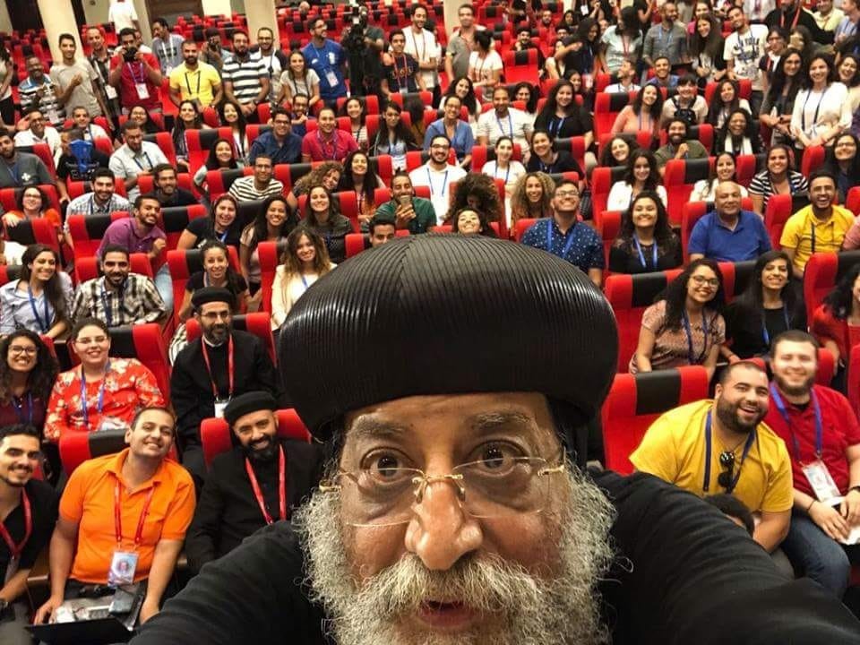 تداول مستخدمو مواقع التواصل الاجتماعي فيسبوك صورة سيلفي سابقة التقطها البابا تواضروس الثاني، بابا الإسكندرية بطريرك الكرازة المرقسية، مع الشباب المشاركين في مؤتمر شباب المهجر في مؤتمر العودة إلى الجذور عام 2018، 2022.