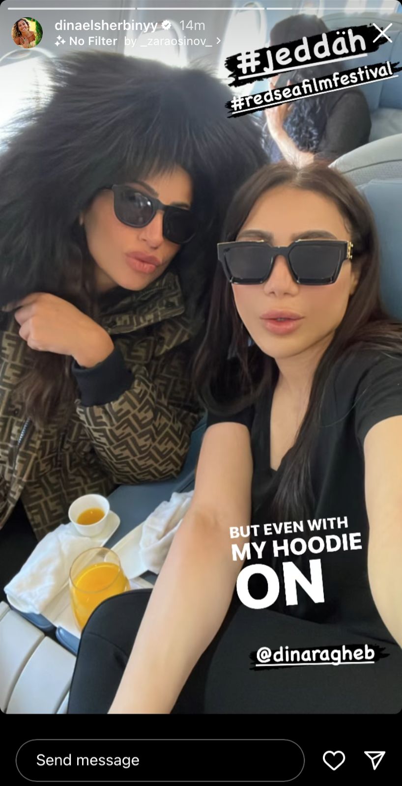 نشرت دينا الشربيني، الصورة عبر خاصية ستوري على حسابها الشخصي بموقع انستجرام، وعلقت عليها قائلة: جدة، مهرجان البحر الأحمر السينمائي، حيث ظهرت فيها برفقة صديقتها على متن الطائرة.