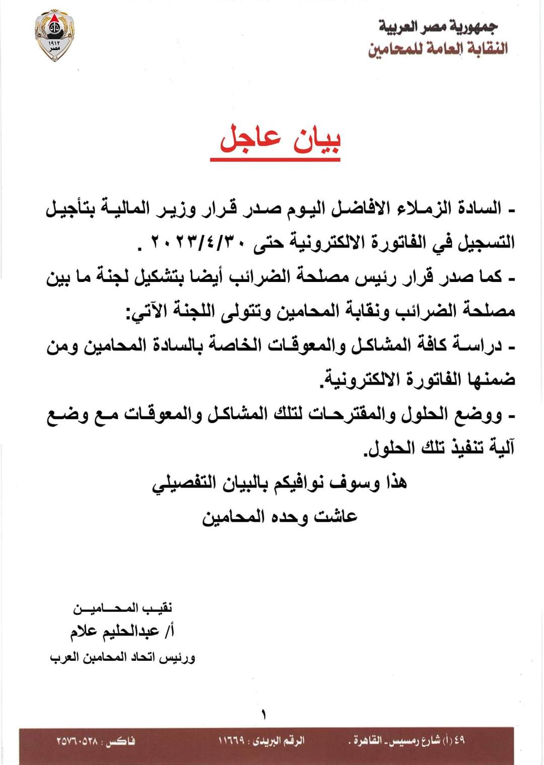 قالت النقابة العامة للمحامين إن وزير المالية أصدر قرار بتأجيل التسجيل في الفاتورة الإلكترونية حتى 30/4/2023.