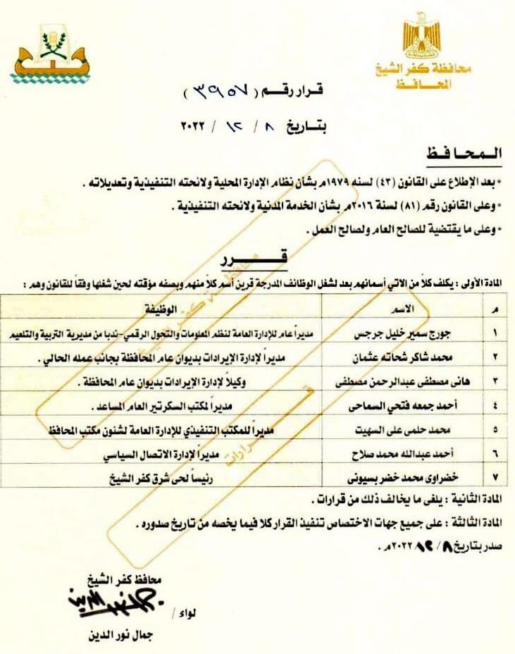 وتضمن قرار محافظ كفر الشيخ تعيين جورج سمير خليل للعمل مديرا عاما للإدارة العامة لنظم المعلومات والتحويل الرقمي بالديوان العام، ندبًا من مديرية التربية والتعليم بمحافظة كفر الشيخ، ومحمد شاكر شحاتة عثمان مديرًا لإدارة الإيرادات بالديوان العام، وهانى مصطفى عبدالرحمن للعمل وكيلا لإدارة الإيرادات، وأحمد عبدالله محمد صلاح للعمل مديرًا لإدارة الاتصال السياسي بالديوان العام، وخضراوى محمد خضر بسيونى للعمل رئيسًا لحى شرق كفر الشيخ.